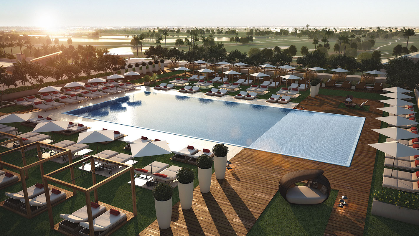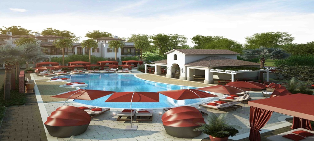 - Piscina con entrada estilo playa con camas de día, cabañas privadas y sombrillas