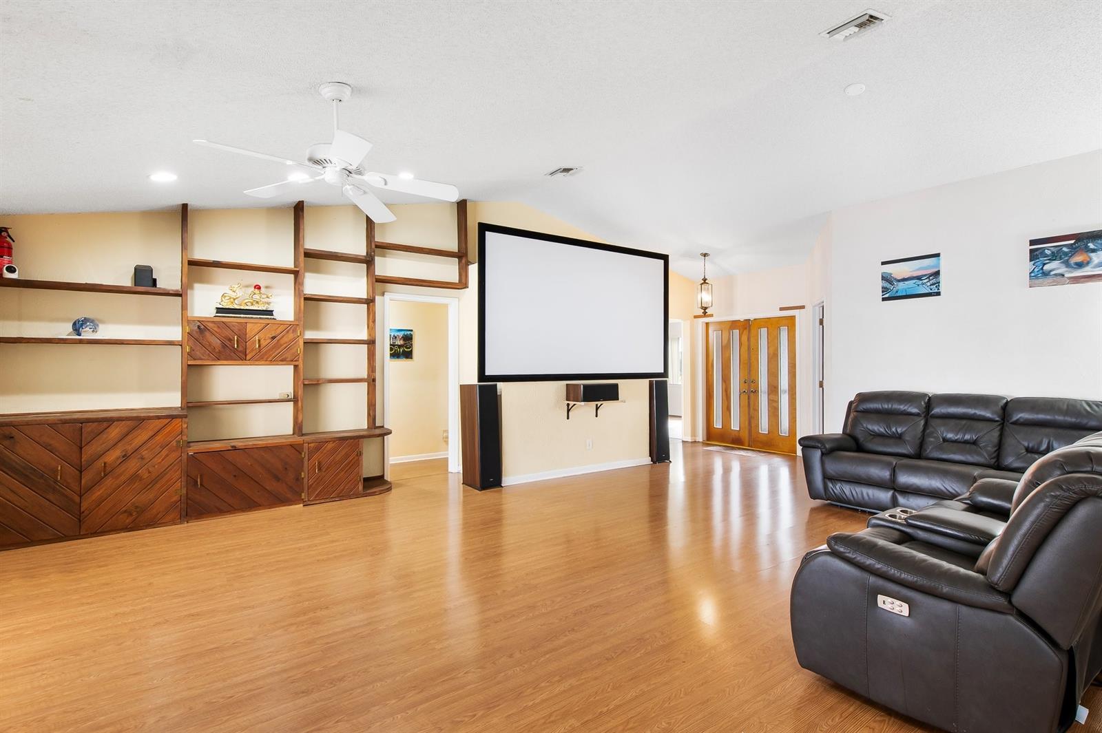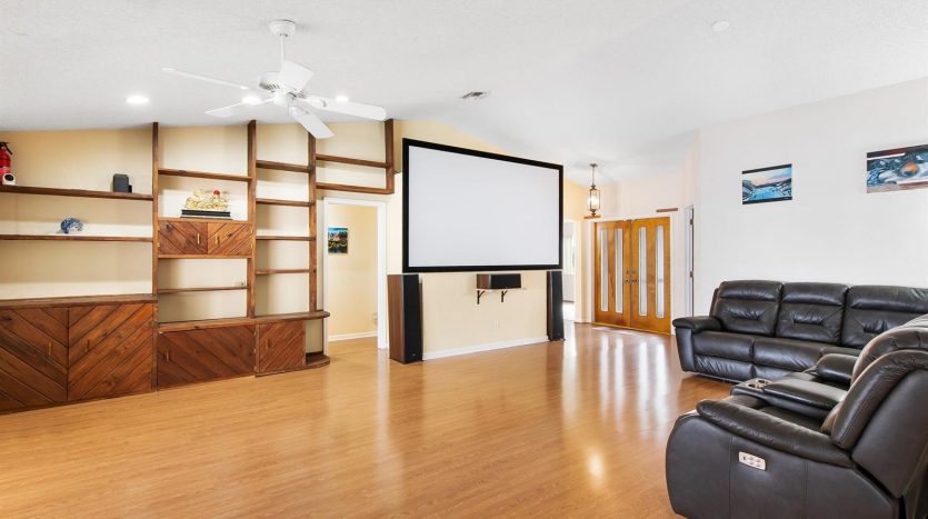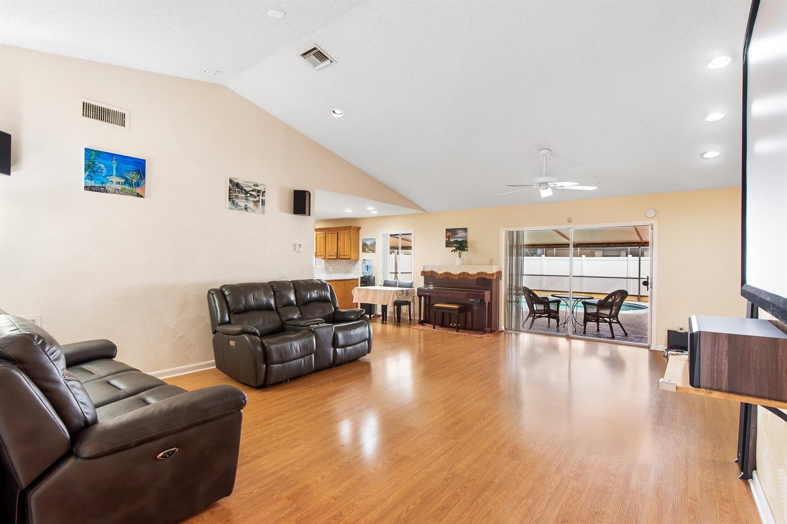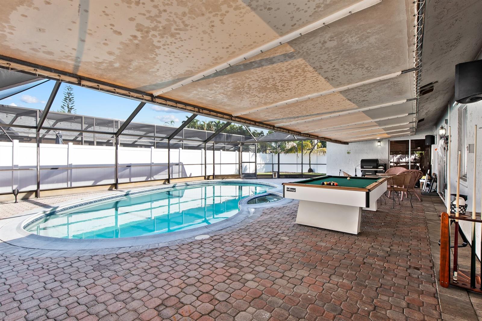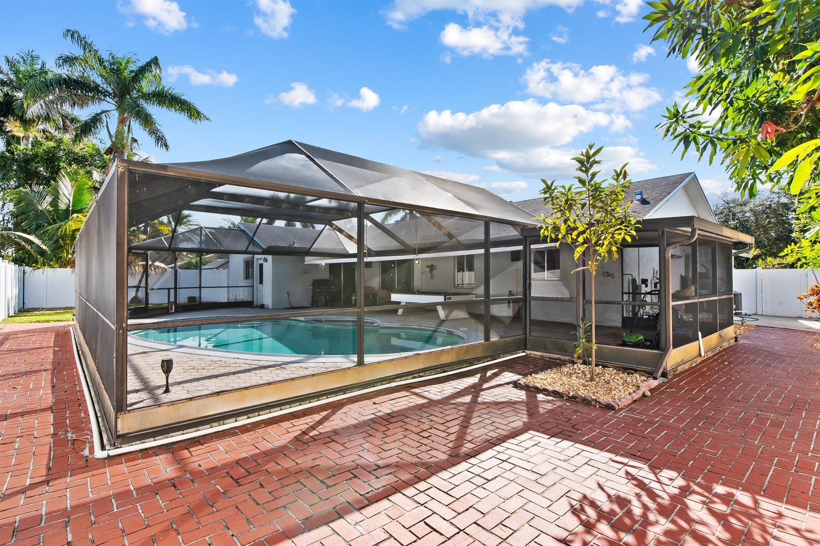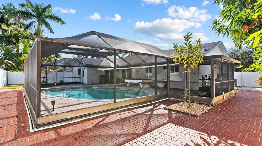 Welcome to this inviting 3-bedroom, 2-bathroom home in a peaceful, no-HOA neighborhood. The open floor plan features vaulted ceilings and a spacious living room with custom shelving, ideal for storage or display. The kitchen offers granite countertops and well-maintained cabinetry. Step outside to the screened-in pool and patio area, perfect for enjoying Florida’s outdoor living. Additional features include Newer roof 2019, CPVC pipes installed 2019, newer a/c 2020, new fence 2024, new dishwasher 2024, a two-car garage and a convenient location near schools, Nova Southeastern University, shopping, and beaches.